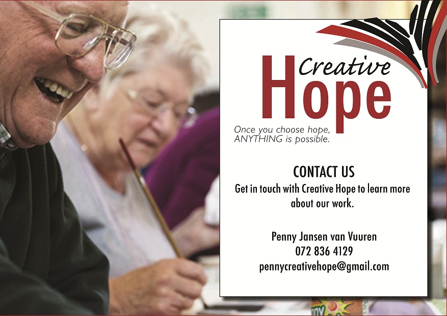 Creative Hope is a Non Profit Organization based in the Western Cape of South Africa. The need for artisic stimulation became evident when founder of Creative Hope. Penny Jansen van Vuuren became aware of how the frail Seniors needed an creative outlet to give them something to look forward to. Penny started by visiting the Old Age Homes, and her passion for the Seniors grew as she started Arts & Crafts sessions with them.